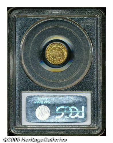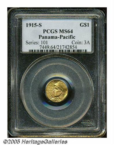 <B>1915-S<G$1> Panama-Pacific Gold Dollar MS64 PCGS.</B></I> Lovely red-orange and lime-green toning adorns the well struck, satiny surfaces. A single small contact marks rests just beneath the cheekbone of the Panama Canal Laborer, preventing the Gem assessment.