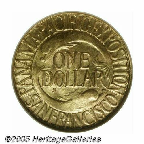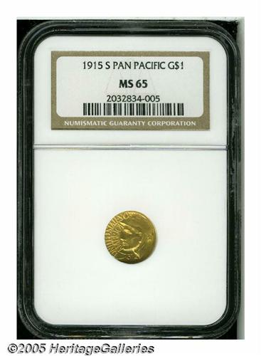 <B>1915-S<G$1> Panama-Pacific Gold Dollar MS65 NGC.</B></I> Extraordinarily clean and clearly suggestive of an even higher grade, the surfaces display smooth, thick, satiny mint luster and luxurious orange-gold coloration.<BR><I>From the Dr. Kurt Peters Collection.</B></I> From the Dr. Kurt Peters Collection.
