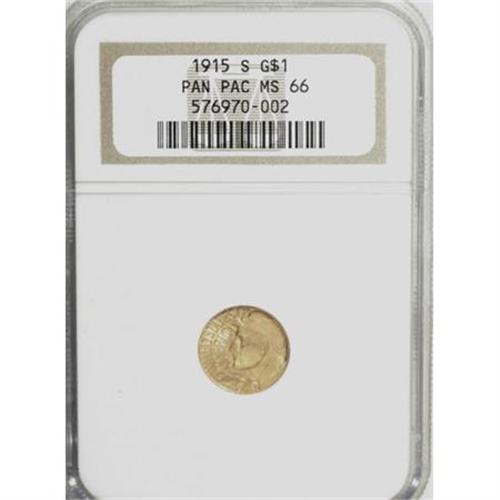 <B>1915-S G$1 Panama-Pacific Gold Dollar MS66 NGC.</B></I> Uncommonly smooth for the issue, both sides display vibrant, frosty luster that provides appreciable cartwheel effects. Deep orange-gold color confirms the originality of this pristine commem. A popular issue, difficult to find in finer grades, and the sole mintmarked commemorative gold dollar.<BR><BR><b>Shipping:</b> Coins & Currency (<a target="_blank" href="http://www.heritageauctions.com/common/shipping.php">view shipping information</a>)