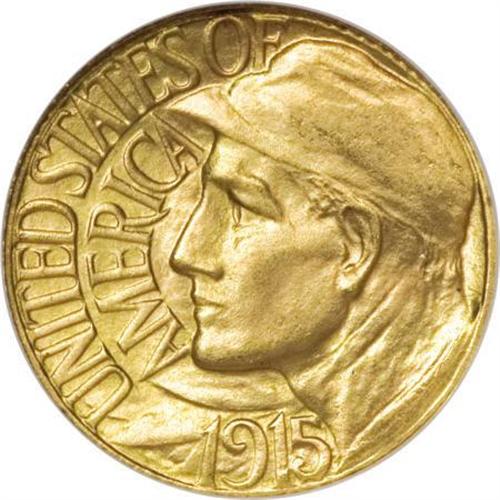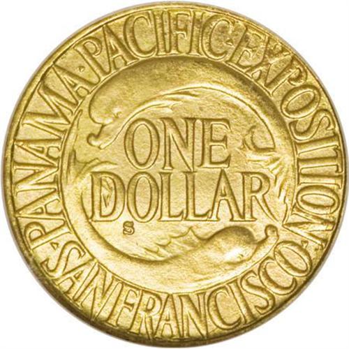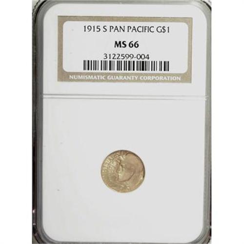<B>1915-S G$1 Panama-Pacific Gold Dollar MS66 NGC.</B></I> An elegant and beautifully preserved MS66 representative of this noteworthy gold dollar issue, crisply struck with warmly lustrous yellow-gold and orange-gold surfaces. The image of the Panamanian worker as a personification of Labor, created by Charles Keck, is the most vibrant device to appear on the obverse of any American gold dollar.<BR><I>Ex: Stack's, February 4-6, 1965, part of lot 717.</B></I><BR><I>From The John Stimson, Sr. Collection, Part Two.</B></I><BR><BR><b>Shipping:</b> Coins & Currency (<a target="_blank" href="http://www.heritageauctions.com/common/shipping.php">view shipping information</a>)