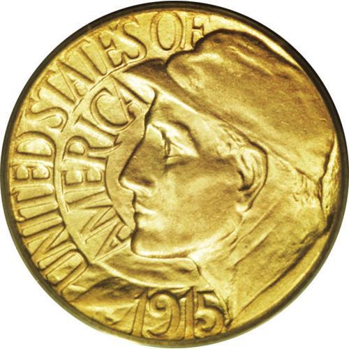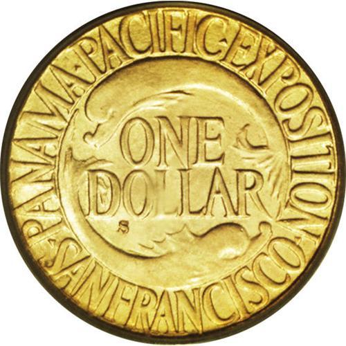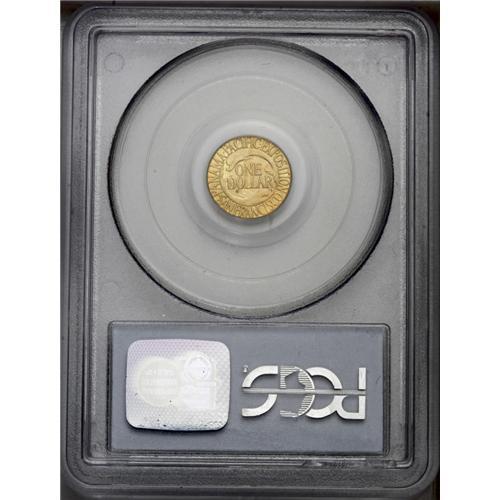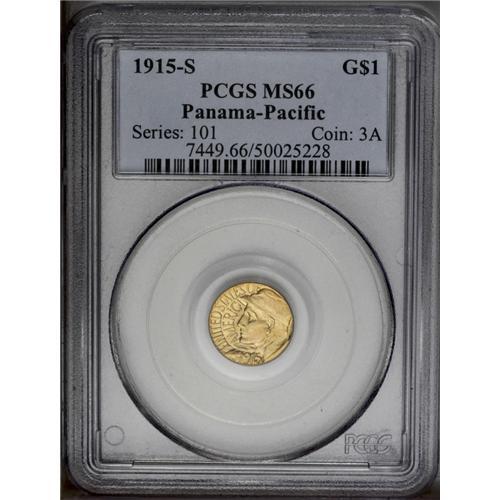 <B>1915-S<G$1> Panama-Pacific Gold Dollar MS66 PCGS.</B></I> Another in a run of these beautiful jewels, this pretty Premium Gem offers consistent, frosty straw-gold surfaces on each side. Even under a loupe no mentionable distractions are seen, although a couple of reverse smudges on the slab may carry over to the photo. PCGS has graded 44 coins finer (6/06).