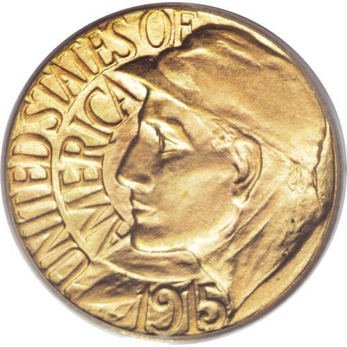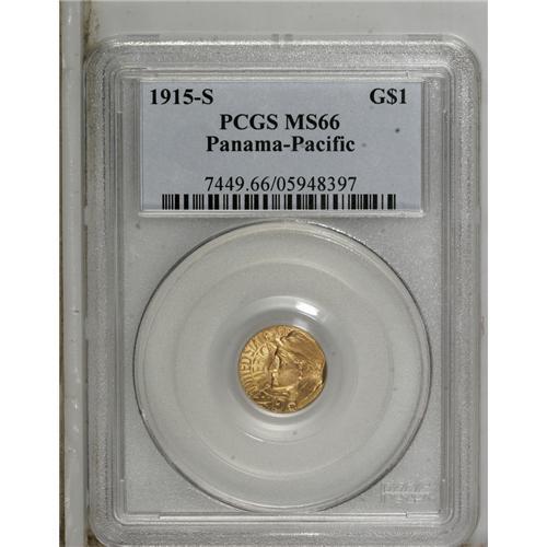 <B>1915-S G$1 Panama-Pacific Gold Dollar MS66 PCGS.</B></I> Some have confused the Panama Canal worker on the obverse with a baseball player, because of the similarity in their caps. While the Pan-Pac gold dollar is relatively available in mint condition, there are few that can "face up to a close up" like this piece. The surfaces are bright and finely granular with lovely mint frost. There are no mentionable marks on either side of this lovely commemorative gold coin.<BR><BR><b>Shipping:</b> Coins & Currency (<a target="_blank" href="http://www.heritageauctions.com/common/shipping.php">view shipping information</a>)