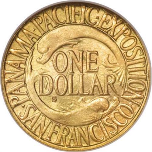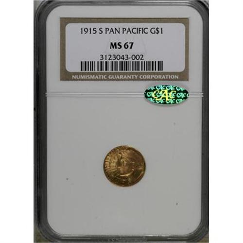 <B>1915-S G$1 Panama-Pacific Gold Dollar MS67 NGC. CAC.</B></I> Exquisitely lovely peach and mint-green colors are intermingled across the satiny, pristine surfaces of this great Superb Gem example. The individual elements of Charles Keck's artistic design are all boldly reproduced. This type was created in conjunction with the Panama-Pacific Exposition of 1915, a grand World's Fair that drew millions of visitors from America and abroad. Census: 46 in 67, 0 finer (2/08).<BR><BR><b>Shipping:</b> Coins & Currency (<a target="_blank" href="http://www.heritageauctions.com/common/shipping.php">view shipping information</a>)