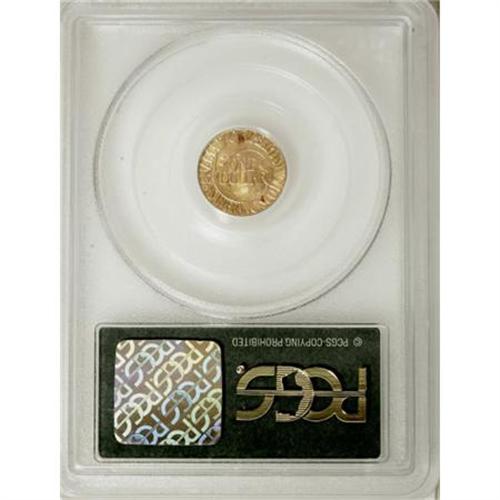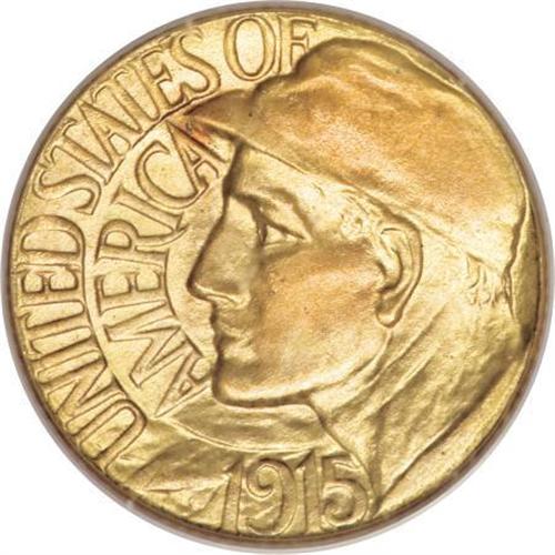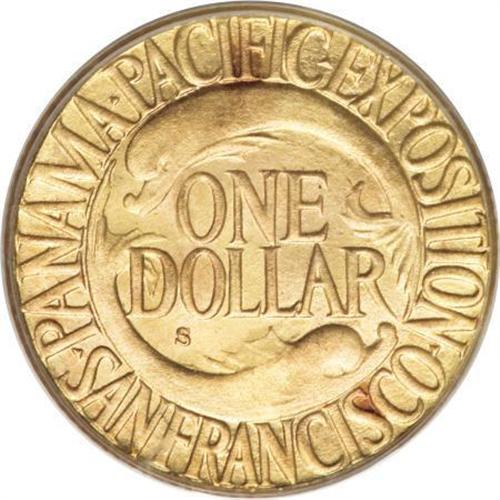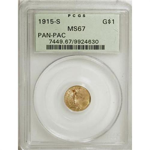 <B>1915-S G$1 Panama-Pacific Gold Dollar MS67 PCGS.</B></I> Among commemorative designers, Charles Keck ranks as an underrated visionary. His 1915 design for the Panama-Pacific gold dollar, for example, received mixed reviews on its debut. In Vermeule's <I>Numismatic Art in America</B></I>, however, the artist finds a measure of redemption in the author's words: "Charles Keck's gold dollar is a novel, daring use of the limited area afforded by such a small, thin coin. Compared with the earlier gold dollars, the coin is a work of art."<BR> Similarly, the Superb Gem offered here is a thing of beauty. The shining surfaces, wheat-gold with a blush of peach, are exquisitely preserved and offer spectacular visual appeal. A noteworthy piece with excellent definition, housed in a green label holder. Neither NGC nor PCGS has certified a numerically finer example (11/07).<BR><I>From The Pinetop Collection.</B></I><BR><BR><b>Shipping:</b> Coins & Currency (<a target="_blank" href="http://www.heritageauctions.com/common/shipping.php">view shipping information</a>)