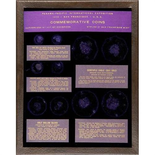 <b>1915-S Panama-Pacific Exposition Double Set Original Frame.</b> An Original Shreve & Co. Copper Frame for a Double Set of Panama-Pacific Commemorative Coins. This is one of the most prestigious examples of this popular Commemorative item that we have ever offered in a long while. The copper frame is nicely patinated and free of the undue bumps, discoloration, and scratches often seen on the few remaining examples. The felt lining is choice, while the deep purple paper caption cards under the coin slots are in excellent condition with no tears or foxing, nice fresh gold printing for the most part. The coins are not included (although they are all available in separate lots in this sale). A clearly important, indeed, an imposing item for the Panama-Pacific Commemorative collector, it may be many years before a Shreve & Co. frame of similar quality becomes available.