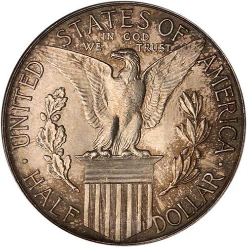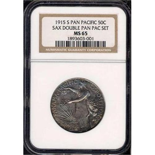 <b>1915-S Panama-Pacific Half Dollar. NGC graded MS65.</b> Beautifully toned. For the date, for the Type, a frosty, natural golden brown and gray gem with sleek cartwheel luster on both sides and tremendous eye appeal. Attractively struck as well, without the usual slight weakness on the head of Liberty or the eagle's breast feathers. Mintage: 27,134. This half dollar was designed by Charles E. Barber (obverse) and George T. Morgan (reverse). The Pan-Pacific coins have the distinction of being the first commemorative coins to carry the motto IN GOD WE TRUST which appears above the eagle (This motto was introduced on the regular circulating coins beginning in 1864.) <b>(PCGS # 9357)</b> <i>