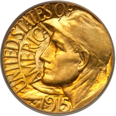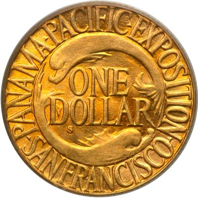 1915-S Panama-Pacific Gold Dollar. PCGS graded MS-64 PQ. Nice golden toning. Clearly the most visually arresting aspect of this coin is its colorful mint luster, warm and glowing. Full spinning luster on both sides, in fact (PCGS # 7449).