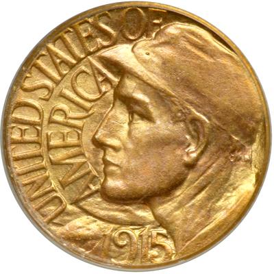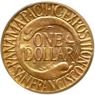 1915-S Panama-Pacific Gold Dollar. PCGS graded MS-65. Lovely gold toning. Only 15,000 struck. A well struck, immaculately preserved, and lustrous Gem that has lovely mint bloom that seesaws with every angle. Charles Keck designed the gold dollar, the obverse of which has the head of a man, representing a Panama Canal laborer. Two dolphins encircle ONE DOLLAR on the reverse (PCGS # 7449).