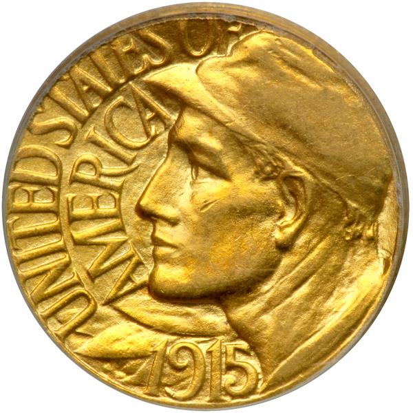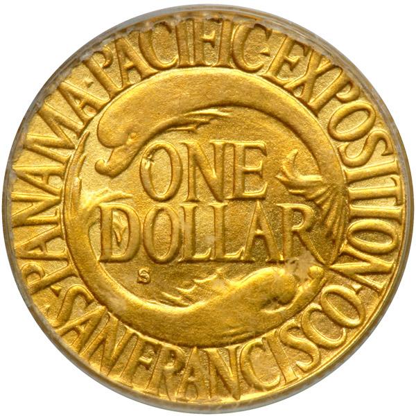 1915-S Panama-Pacific Dollar. PCGS graded MS-64 PQ. Beautiful natural greenish-golden mint bloom colors. A Premium Quality coin for the given grade (PCGS # 7449) .