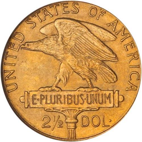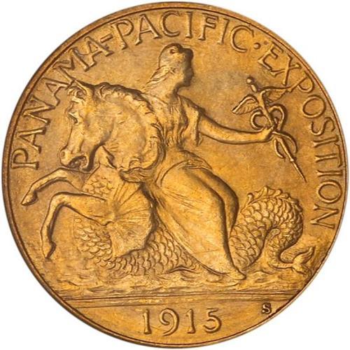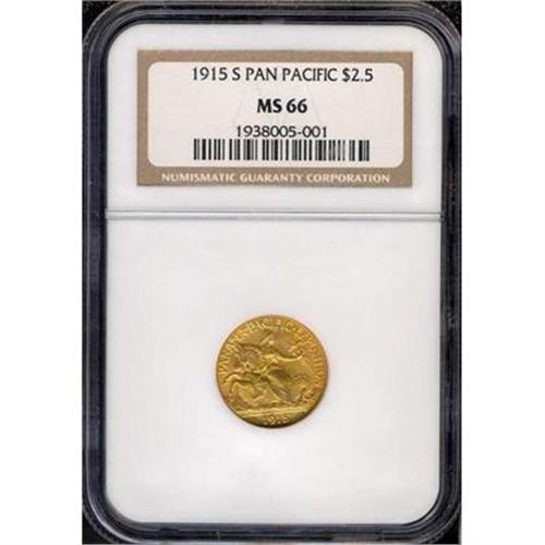 <b>1915-S Panama-Pacific Gold $2.50. NGC graded MS66.</b> NGC Pop: 421. There is much to say about the beautiful surfaces of this Pan-Pacific coin since they are nearly perfect, a quality almost unimaginable to the average collector who sees only high grade circulated pieces or dullish Mint States in the usual coin shows. The mint frost is aglow with warm orange gold intensity one likes to see over each side. There is just a bit of light patina as well. The quarter eagle was the work of Charles E. Barber and George T. Morgan. It is the first commemorative coin of this denomination <b>(PCGS # 7450)</b> <i>