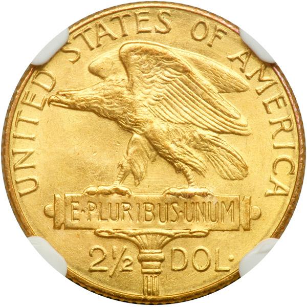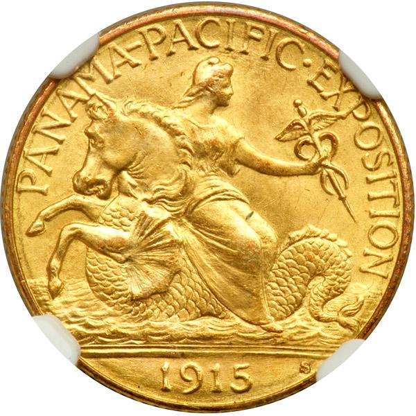 1915-S Panama-Pacific Gold $2.50. NGC graded MS-67. Well struck with attractive golden toning. Among the finest known. The Pan-Pacific Quarter Eagle is a most important addition to America's Commemorative coin series, and it is only rarely that a Superb Gem quality example of the date has been certified (see below). The original mintage was less than generous by modern reckoning: 6,749 coins, and many Mint State examples survive, but nearly all of those are in the lower numeric grades. This example is boldly made and has brilliant, frosted luster with only the slightest of surface marks, consistent with the superlative grade. It has rich vivid-gold color and exceptional aesthetic appeal. Devices are 100% bold. A wonderful example for the Panama-Pacific connoisseur who appreciates the combination of rarity, beauty and top quality. Pop 15; none finer at NGC .