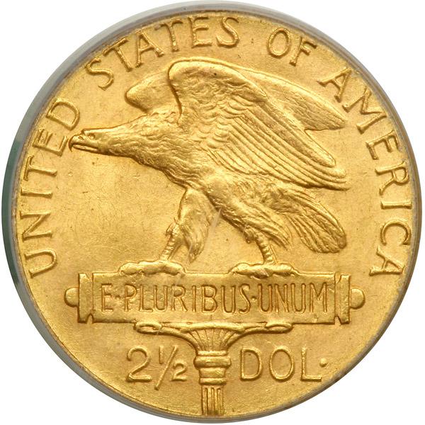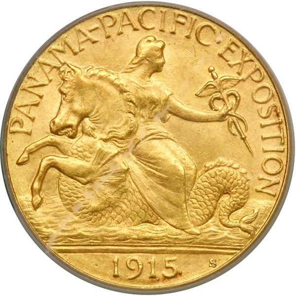 1915-S Panama-Pacific Gold $2.50. PCGS graded MS-65. A frosty mint gem with a hint of natural tone. This offering is one of more attractive coins available. The presentation of this piece is amazing. Surfaces are exceptionally clean, with no toning spots or significant marks, indicating the piece has been carefully treasured and protected for nearly a century. Sharply struck, lustrous surfaces gleam with a vivid frosty golden patina. Though $2.50 Pan-Pacifics are not uncommon in auction offerings, in this state of preservation the coin is extremely desirable. A beautiful example of an historic issue and one that is truly a "numismatic treat" whose next owner will find it highlights his Commemorative gold collection (PCGS # 7450) .