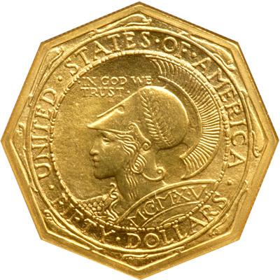 Both $50 gold pieces were the handiwork of Robert Aitken. Since many of them were purchased by wealthy individuals (they were not necessarily coin collectors), it stands to reason a fair number of them would have been slightly handled (or even mishandled) by their owners or heirs. With this in mind, is it any wonder why so few Gem Mint State 65s of the innovative octagonal motif survive today? A significant number were cleaned. This lovely Gem is perfectly fitted to match the Round $50 gold in this sale with the same grade. The coin displays bountiful and serenely beautiful soft golden color, several degrees finer than most of the competition. The surface radiates a pure satiny luster that, dare we say, should be awarded first prize in a contest for originality! No observable blemishes are found, omitting not even the smallest detail when scrutinized with a loupe -- making this an impressive Gem specimen for the well-heeled numismatist. In summation, one of the most significant issues in the U.S. Commemorative series. Pop 41; 10 finer, 6 in 66, 4 in 67.