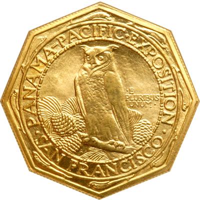 1915-S Panama-Pacific Gold $50 Octagonal. NGC graded MS-65. Only 645 pieces struck. Nice light golden toning and boldly struck. Outstanding Gem quality for the Type. The Mint Act of January 16, 1915 authorized a fifty dollar gold piece along with a gold $1, a gold quarter eagle, and a silver half dollar to commemorate the Panama-Pacific International Exposition scheduled to open in San Francisco that year. Proceeds from sale of these commemorative coins would help defray the cost of exposition. Several events were being commemorated, including the opening of the Panama Canal in 1914.