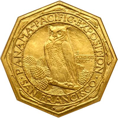 The obverse of both fifty dollar coins depicts the Roman goddess Minerva (same as the Greek goddess Athena), while the reverse displays an owl, said to be sacred to Minerva and a symbol of wisdom. Some suggest that the motifs alluded to the need for America to be watchful and prepared on the eve of this country's involvement in World War I, already raging in Europe. The basic round and octagonal designs were the same, everything from the outer text ring inward, though reduced in size for the octagonal piece. On both obverse and reverse Aitken placed an unbroken circle of dolphins into the spaces provided by the angled corners of the octagonal design. Dolphins were considered friends and guardians of sailors, and were symbolic of the new connection between the Atlantic and Pacific Oceans provided by the Panama Canal (PCGS # 7452) .