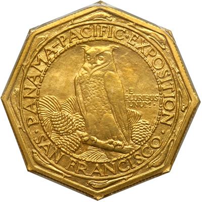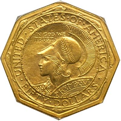 1915-S Panama-Pacific Gold $50 Octagonal. PCGS graded MS-63. Nice golden toning. Only 645 struck. A highly lustrous specimen, somewhat satiny on both sides due to the treatment of the dies. A few light hairlines and marks at centers, as typical such a large, heavy and soft-metal gold coin. This commemorative often comes heavily cleaned, to which this is a pleasing exception. At the Mint State 63 level certified by PCGS, this is one of the most eye-catching gold pieces in the series, not only because of its size but also for the sheer beauty of the designs.