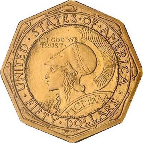 America's fairs and expos usually revolve around a theme. For 1915, the fair organizers honored the discovery of the Pacific Ocean (1513) and the aforementioned completion of the Panama Canal (1914) as the dual anchor points for their theme. A series of 5 coins was struck for the occasion, including complete sets mounted in metal frames or leather cases sold for $200. Many sales were made to banks and other novices; for this reason, high grade examples, especially of the two $50 gold denominations, are a challenge to find. The larger the denomination, the harder to locate. Some were also carried as souvenir pieces, in fact. This is one of the few remaining choice octagonal $50 gold coins from that commemorative event. A coin with satiny luster and strikingly attractive features. A coin whose mere ownership puts you into an elite group of collectors.