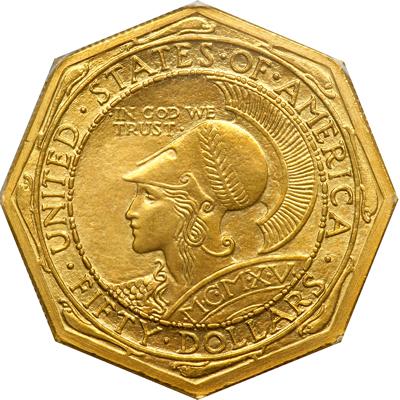 During planning for the Panama-Pacific Exposition's coin striking ceremony, the Philadelphia Mint shipped a 14-ton hydraulic press to the fairgrounds for the specific purpose of minting these large $50 gold pieces (Research has not been able to ascertain how they managed it: probably the press went disassembled by ship.)