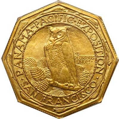 On June 15, the first octagonal pieces were struck at a ceremony which attracted VIps from all over. The ceremony had been arranged by Farran Zerbe, then possibly the best known numismatist of his day. Zerbe had the political influence to have himself put in charge of the Exposition's Coin and Medal Department, which was named in the authorizing act as responsible for distributing the commemorative coins. Zerbe set up his own collection (over 20,000 specimens after he included additions) in a trellised display area of the Palace of Liberal Arts on the Exposition grounds labeling it Zerbe's Unique Money of the World. It became one of the more popular displays, and the Panama-Pacific Commemorative coins, each with its own story appended, were probably seen by several million visitors between the Exposition's opening February 20 and its close on December 4, 1915. Pop 118; 18 finer; 17 in 65; 1 in 66. (PCGS # 7452).