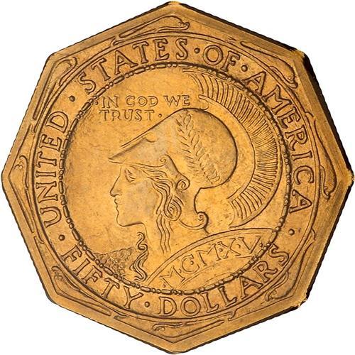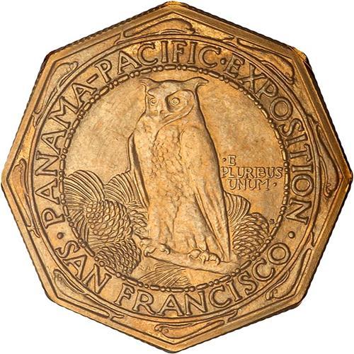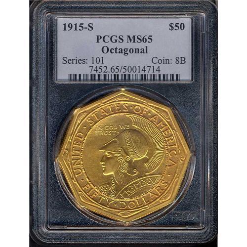 Today the five different coins issued in connection with the Panama-Pacific International Exposition stand as the high-water mark of American commemoratives. The $50 octagonal is legendary in U.S. federal coinage, both for its size ($50 or two and one-half ounces of 900 Fine gold) and format. The artistry was by Robert Aitken, noted sculptor and coin designer whose handiwork presents Minerva, goddess of the harvest, wearing a Corinthian plumed helmet. (The Romans identified their goddess of war as Minerva. She ranked third among their gods, after Jupiter and Juno. Minerva also was worshiped as the goddess of wisdom and of crafts, namely weaving and spinning.) Aitken used a more down-home emblem for his reverse, a "wise" owl perched upon a pine branch. Minerva's owl is golden and beautiful, and we'll just say "wise" on this foremost of all U.S. commemorative gold pieces! What more spectacular way to preserve the occasion than with this well struck, satin-gem Mint State 65 certified by PCGS.