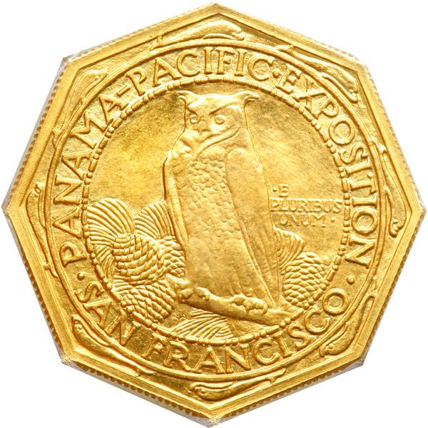 1915-S Panama-Pacific Gold $50 Octagonal. PCGS graded MS-64. Rich golden toning. Only 645 pieces struck. Lovely and agreeable color with every detail boldly struck. The Mint Act of January 16, 1915 authorized a fifty dollar gold piece along with a gold $1, gold quarter eagle, and a silver half dollar to commemorate the Panama-Pacific International Exposition scheduled to open in San Francisco that year. Proceeds from sale of these commemorative coins would help defray the cost of exposition. Several events were being commemorated, including the opening of the Panama Canal in 1914.
