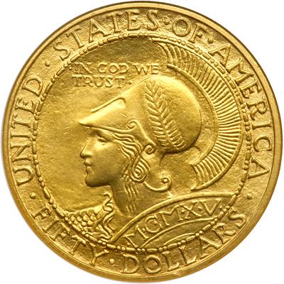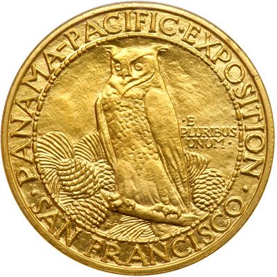 Five coins commemorating the Panama-Pacific International Exposition were produced, as well as an extensive range of private medals (refer to the Hibler-Kappen book of So-Called Dollars for these). The $50 gold pieces were by Robert Aitken, a sculptor from New York. "Cornelius Vermeule, in his Numismatic Art in America, Aesthetics of the United States Coinage, offers beautifully crafted commentary of Aitken's design" [as explained in a Pan-Pacific $50 gold description by the auction firm Heritage]: