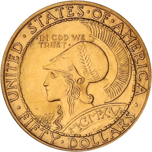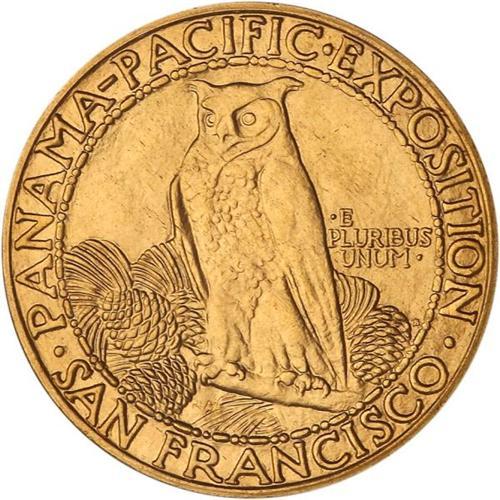 All of America's fairs and expos have a theme. What would a "world's exposition" be without a theme? For 1915, the fair organizers paid tribute to Vasco Núñez de Balboa's discovery of the Pacific Ocean (1513) as well as to completion of the Panama Canal (1914) -- there were the dual anchor points for the fair's theme. A series of 5 coins was struck for the occasion, including complete sets mounted in metal frames or leather cases sold for $200. Many sales were made to banks and other non-collecting individuals or organizations; for this reason, high grade examples, especially of the key $50 gold denominations, are a challenge to find. The larger the denomination, the harder to locate. Some were also carried as souvenir pieces, sad to say. When all was said and done, only 483 Round $50 gold pieces were sold. And it can be assumed (though no separate records were kept in this regard) that numerous specimens in the hands of the public were melted after the federal government seized America's gold coins in 1933. We estimate there are 200 or so of the round $50 pieces remaining, with a coin at this prized Mint State 66 level nothing short of extraordinary!