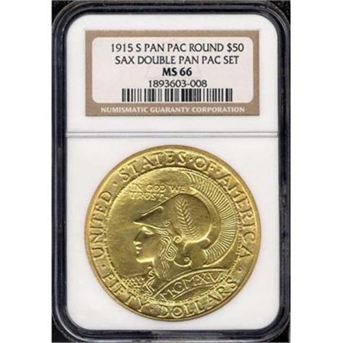 <b>1915-S Panama-Pacific Gold $50 Round. NGC graded MS66.</b> California sun-fresh gold as befits a humongous gold coin from the Golden States, indeed the fact is that this heavenly MS66 specimen is glowing with gold satin luster, and fully radiant at that, with a near-perfect strike. Taking stock of the key aspect of the grade, this piece has knife-edged devices throughout, including centers, rather than a soft, mushy strike as most often seen.