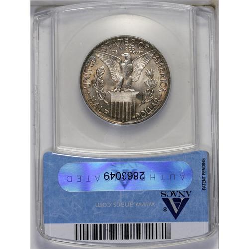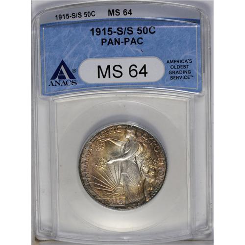 <B>1915-S/S<50C> Panama-Pacific MS64 ANACS.</B></I> Breen-7432. Warm red, orange, and electric blue surround an untoned center. Some strike weakness is noted in the drapery. The mintmark doubling is quite visible. Overall, a solid near-Gem with great eye appeal.<BR><I>From The Redfjord Collection.</B></I>