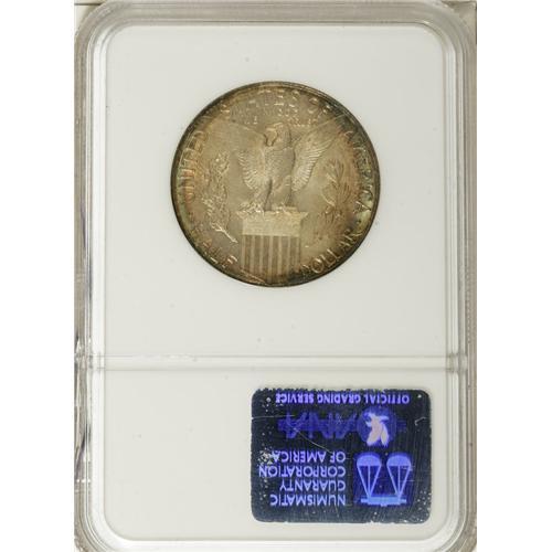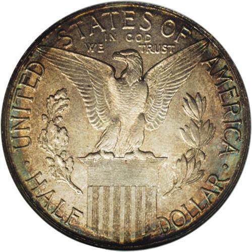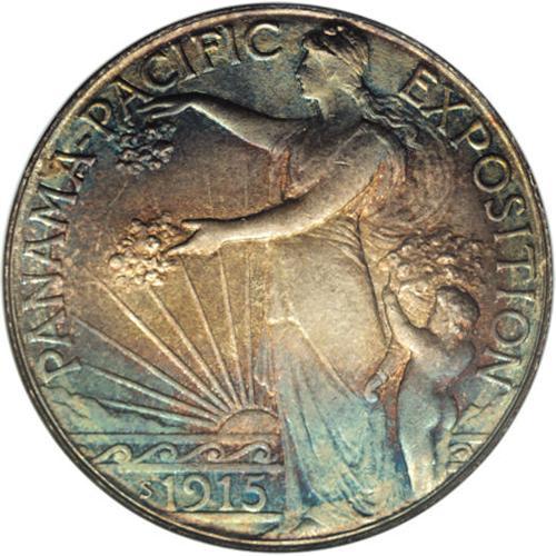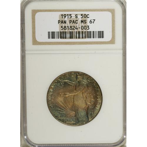 <B>1915-S/S 50C Panama-Pacific MS67 NGC.</B></I> Mintmark repunched north. While half dollars rank as a mainstay of both classic and modern commemoratives, 22 years passed between the 1893 Columbian halves and the 1915-S Panama-Pacific designs. The obverse has lovely bands of powder-blue, rose-violet, and aqua-green color that encroach upon the golden centers, while the reverse has slightly softer turtle-green and lavender-gray patina. A razor-sharp Superb Gem with lovely luster and seemingly pristine surfaces. NGC has graded no numerically finer examples, while PCGS records note just two such pieces (3/07).<BR><I>From The Cary & Cheryl Porter Collection.</B></I><BR><BR><b>Shipping:</b> Coins & Currency (<a target="_blank" href="http://www.heritageauctions.com/common/shipping.php">view shipping information</a>)