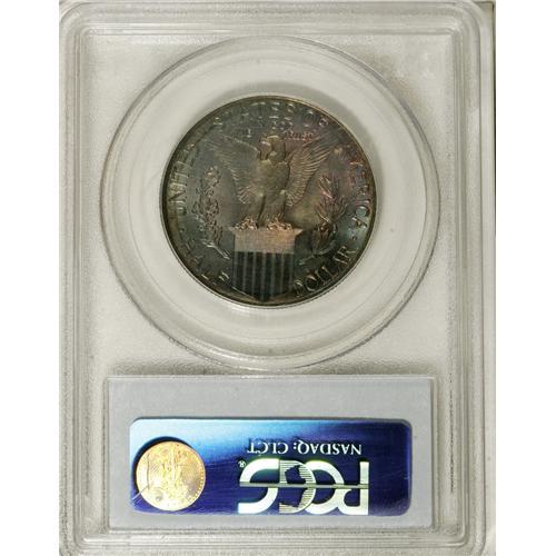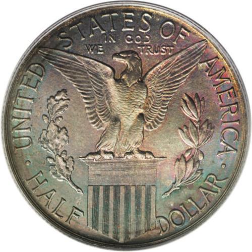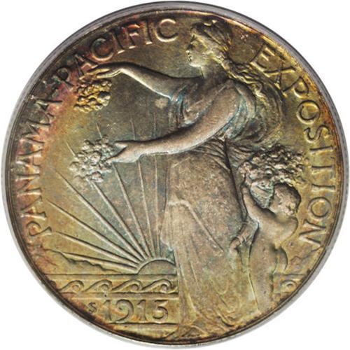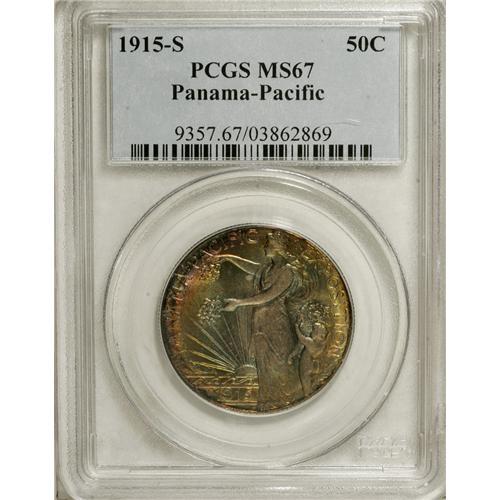 <B>1915-S/S 50C Panama-Pacific MS67 PCGS.</B></I> Mintmark repunched east. Of the four denominations and five designs of the Panama-Pacific commemoratives, the half dollar was the most affordable and most accessible to fairgoers. As such, it is little surprise that the half's net mintage of 27,134 pieces was the largest. A crescent of plum toning graces the upper left obverse, while the rest of that side has outer orange-gold toning and a blue-green center. The reverse exhibits pink-violet toning near the margins and blue-gray at the central devices. PCGS has awarded a higher grade to just two coins (4/07).<BR><I>From The Cary & Cheryl Porter Collection.</B></I><BR><BR><b>Shipping:</b> Coins & Currency (<a target="_blank" href="http://www.heritageauctions.com/common/shipping.php">view shipping information</a>)