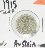 1915 SILVER AUSTRIA 10 CENT *RARE MS HIGH GRADE NICE EARLY COIN WITH NICE DESIGN!! COIN CAME OUT OF SAFE!! ***Coin, Currency & All Items Listed in this auction - Grades, Conditions and Values are not Safe Deposit Coins LLC Responsibilty. Grades, Condition and Values are determined by Consigner(s) & Buyers ONLY