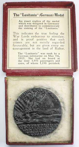 With original box. A British propaganda copy of a German medal issued to mark the sinking of the Lusitania off The Old Head of Kinsale, Co. Cork, on 7 May 1915 (the medal is incorrectly dated "5 May"). The obverse shows the ship sinking with weapons piled up on its decks. "KEINE BANN WARE" ("NO CONTRABAND"), and the reverse shows a skeleton selling tickets for Cunard to a queue of passengers inscribed "GESCHAFT UBER ALLES" "BUSINESS ABOVE ALL"). These copies were sold for one shilling each in Selfridges to raise funds for charities."