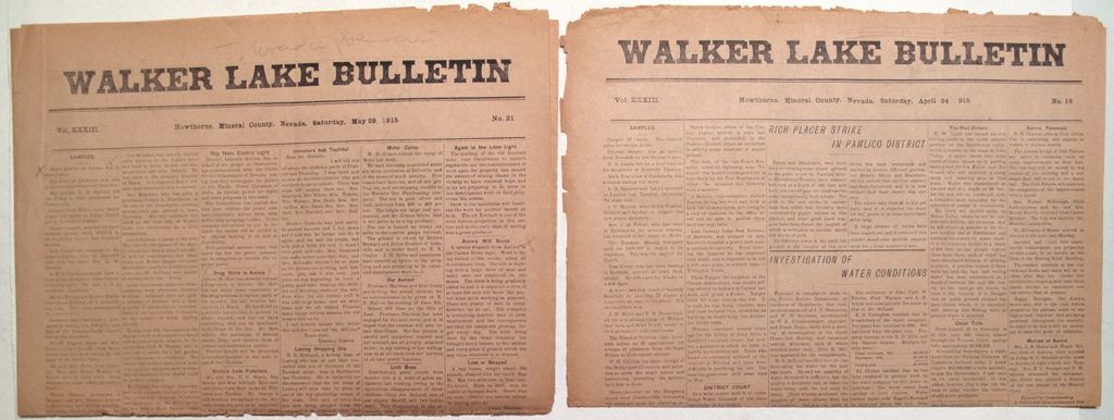 Two papers. A Nevada Democratic newspaper. News about the Aurora drug store and other people living in Aurora. Also mentioned Sheriff Grutt, E. B. Yerington, R. Gignoux, etc. Article on rich placer strike in Pamlico and an Aurora boom. As with all old newspapers the paper is very fragile, but the historical value in articles and advertising is tremendous. Due to size, additional shipping fees may be required.