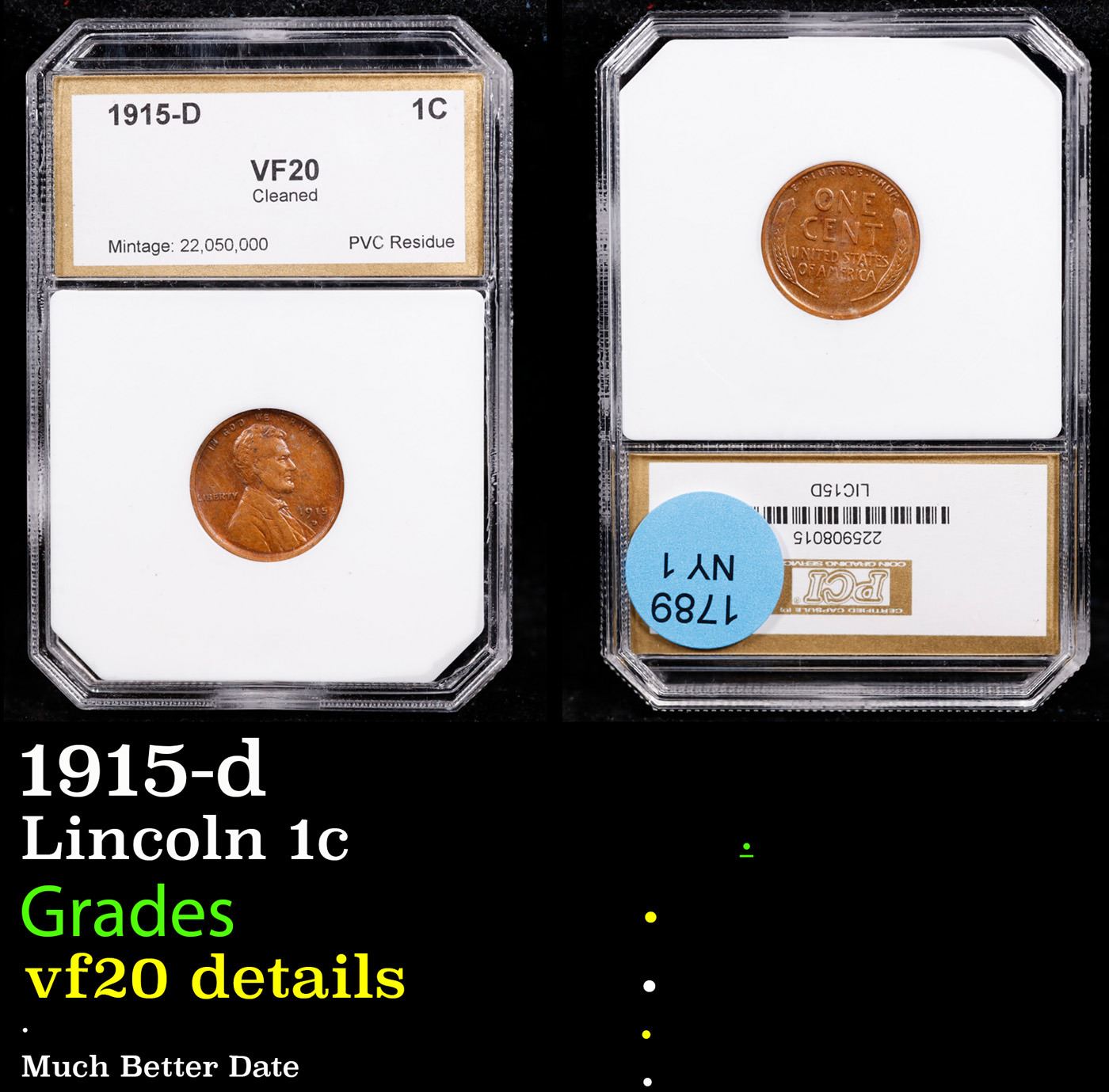 1915-d Lincoln Cent 1c Graded vf20 details By PCI. Incredibly scarce date. Per David Hall at PCGS " Like the 1913-D, the 1915-D is a scarce and somewhat underrated semi-key date"