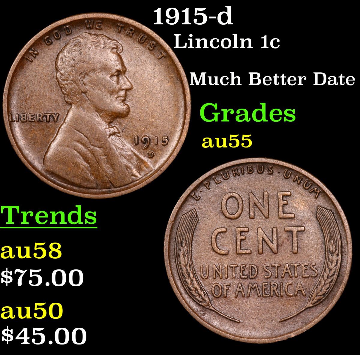 1915-d Much Better Date . Lincoln Cent 1c Grades Choice AU. Incredibly scarce date. Per David Hall at PCGS " Like the 1913-D, the 1915-D is a scarce and somewhat underrated semi-key date"