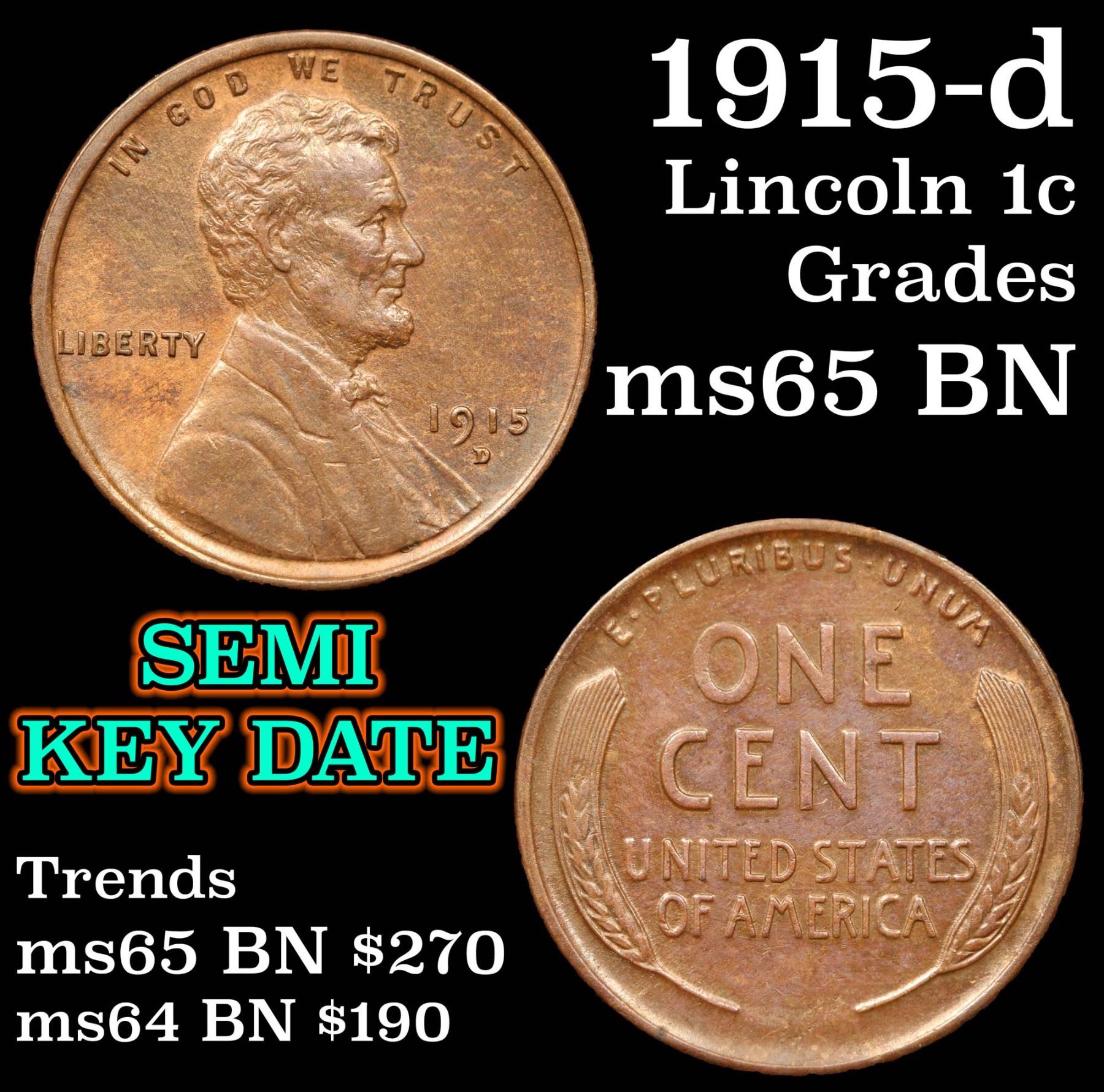 1915-d Lincoln Cent 1c Grades GEM Unc BN. Incredibly scarce date. Per David Hall at PCGS " Like the 1913-D, the 1915-D is a scarce and somewhat underrated semi-key date"