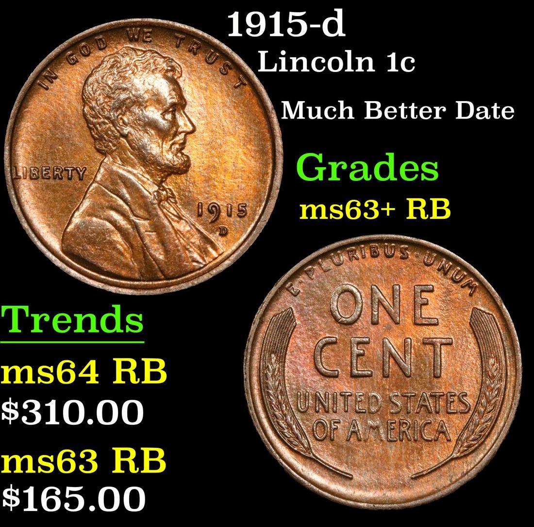 1915-d Much Better Date . Lincoln Cent 1c Grades Select+ Unc RB. Incredibly scarce date. Per David Hall at PCGS " Like the 1913-D, the 1915-D is a scarce and somewhat underrated semi-key date"