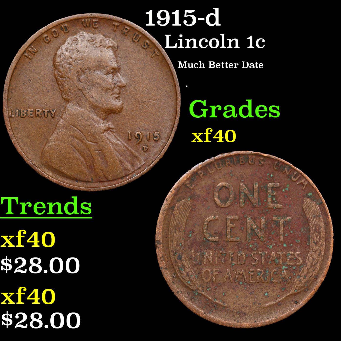 1915-d Lincoln Cent 1c Grades xf. Incredibly scarce date. Per David Hall at PCGS " Like the 1913-D, the 1915-D is a scarce and somewhat underrated semi-key date"