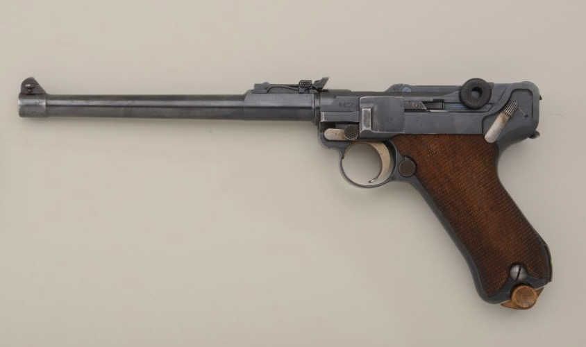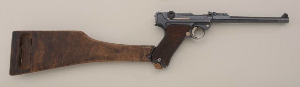 1915 dated Artillery Luger with stock and holster, in fine to near excellent condition showing "DWM" arsenal markings, fine tuning front and rear sight, serial #6852a. A notarized affidavit by James A. Wing, Major,U.S.A., Retired, states "In May 1945, the 5th Armored Division with 628 Tank Destroyer Battalion attached, was holding a position on the Elbe River". He states that his unit was holding while the Russian Army tookBerlin. He further states the 2nd Armored, located on his unit's right, maintained a compound where Germans were surrendering weapons of all types. He states that an old gentleman wearing a WWI overcoat gave him apistol that was issued to him in WWI, when he was an officer in the artillery. He mentions trading the pistol to a well known Montana collector at this date. The Luger retains 97-99% original bright blue finish,just some slight loss on the high point of the side plate and left front of muzzle from being carried in the holster. The grips are excellent; the trigger, safety, latch and small parts show most of their "straw"