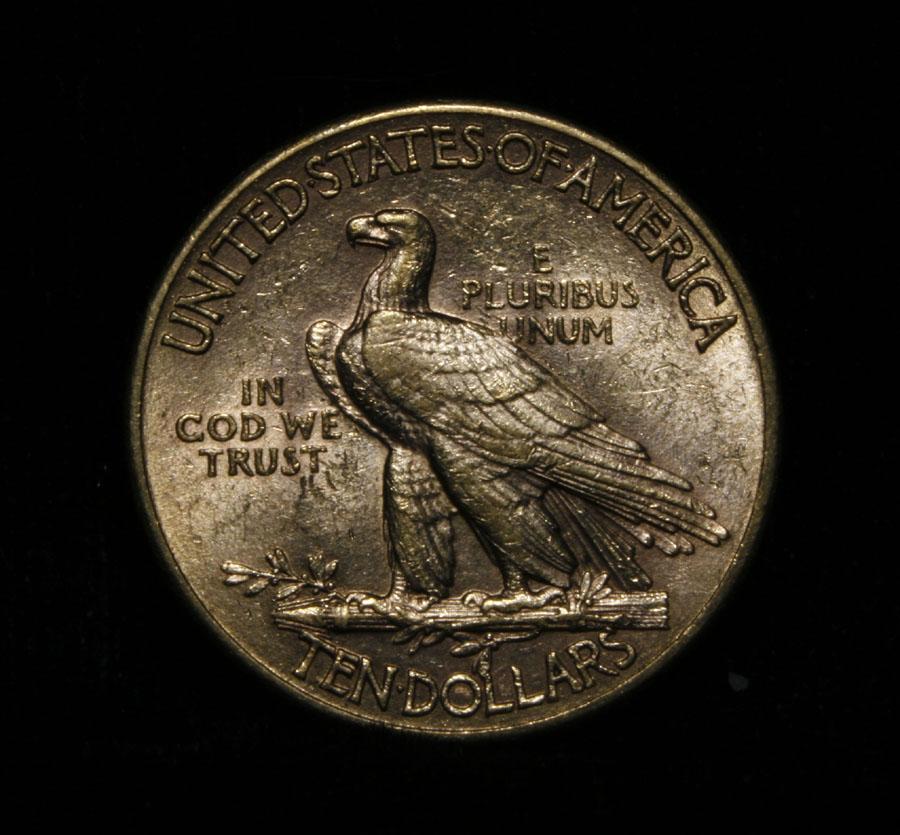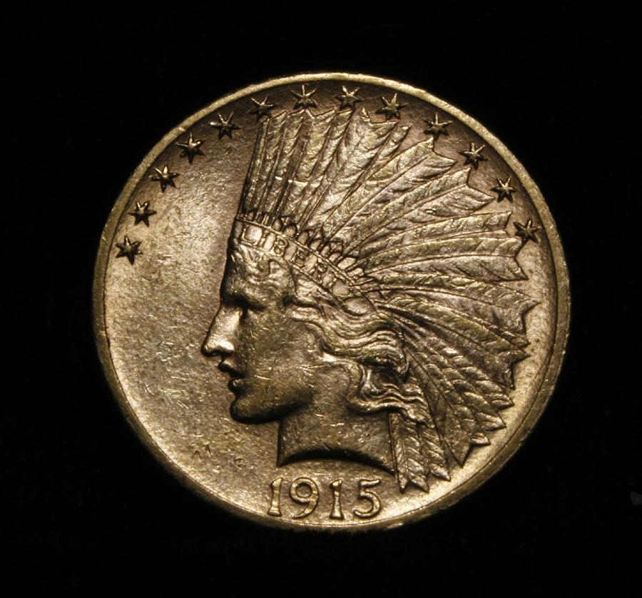 The $10 Indian, the last coin designed by St. Gaudens before his death, depicts a female Lady Liberty, Possibly his wife, wearing an Indian War Bonnet. This is a nice example of a beautifully designed coin. Coin World's Coin Values lists ms63 $2250. The Wholesale Greysheet lists ms63 at $1550. Estimated Value $1750