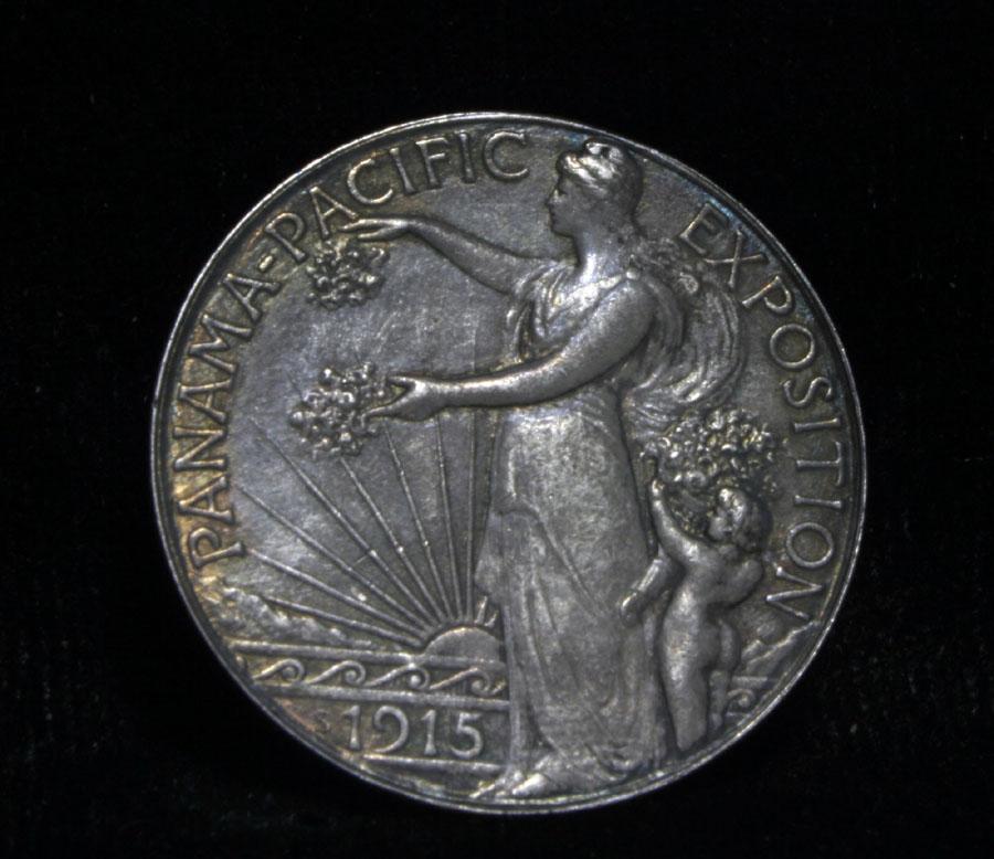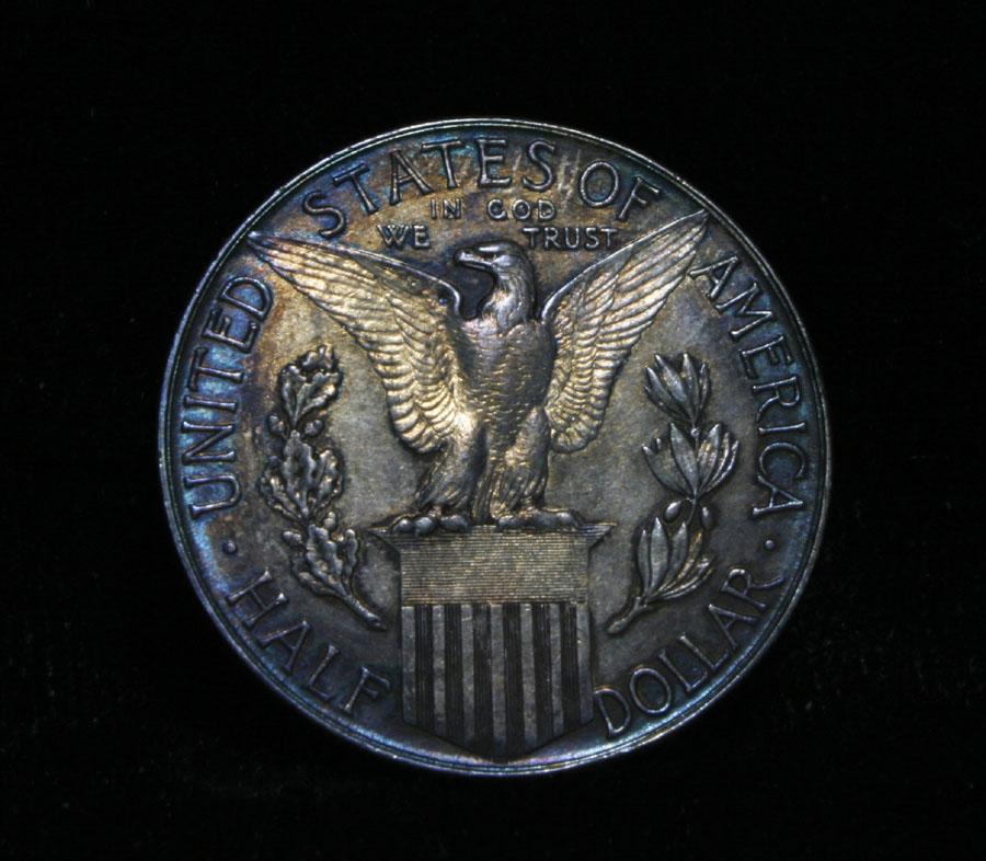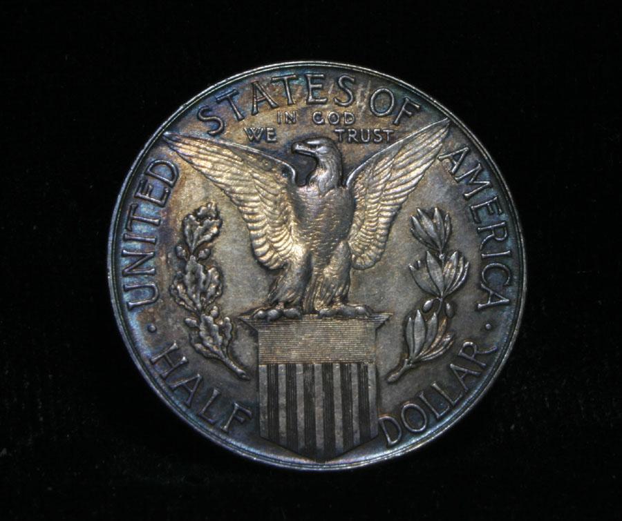 Exceptionally Rare Commemorative. Heavily toned example , with nice iridescent colors on the reverse. The Pan Pac was minted along with 4 other coins to commemorate the completion of the Panama Canal and distributed at the Panama pacific exposition in San Francisco which also celebrated the renewal of san Francisco since the Great Fire. When Examining a{an Pac Half Dollar note that there is a problem with Pan-Pac halves in its strike: Weakness is often evident on Columbia’s head, cap, arm and body, also on the eagle's breast feathers and claws. Occasionally, coins are seen with a rim indentation near the periphery on each side; this is a mint caused problem and should not be factored into the grade. When grading lightly circulated examples, friction is first evident on Columbia's shoulder and on the eagle's breast. Coin World's Coin Values Lists the ms63 at $850. The Wholesale Greysheet Value of ms63 is $640. Estimated Value $750