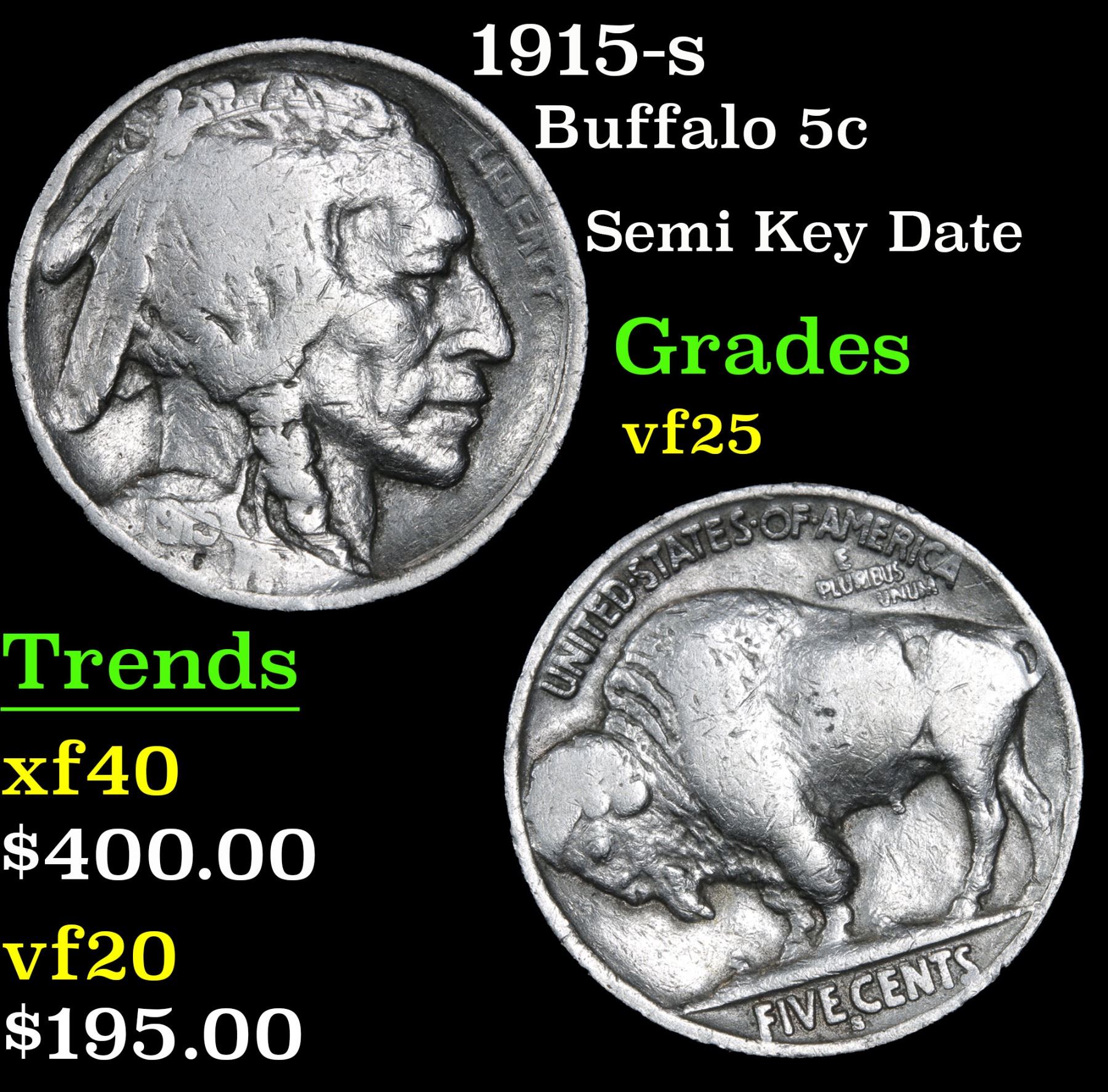 1915-s Buffalo Nickel 5c Grades vf+. A tough date. Semi Key Date