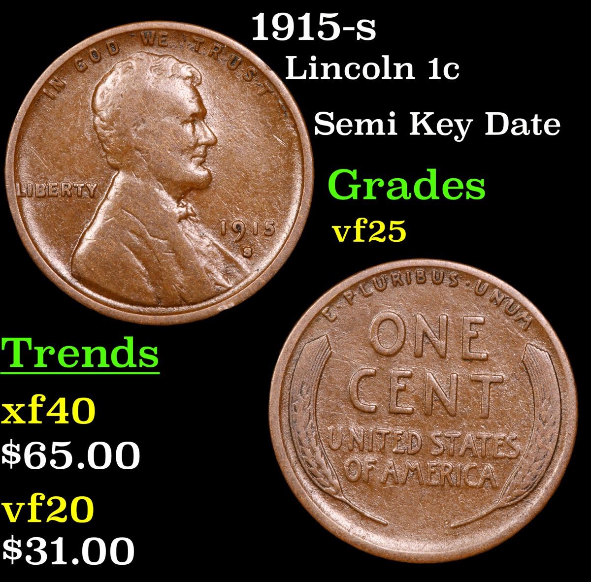 1915-s Semi Key Date . Lincoln Cent 1c Grades vf+.