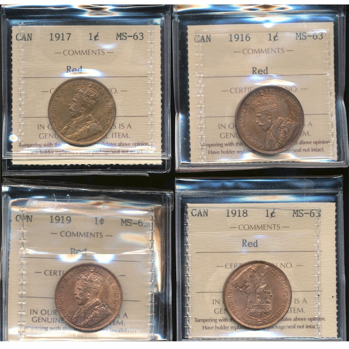 1916 1¢, 1917, 1918 & 1919 all ICCS MS63RD. Lot of 4 coins.