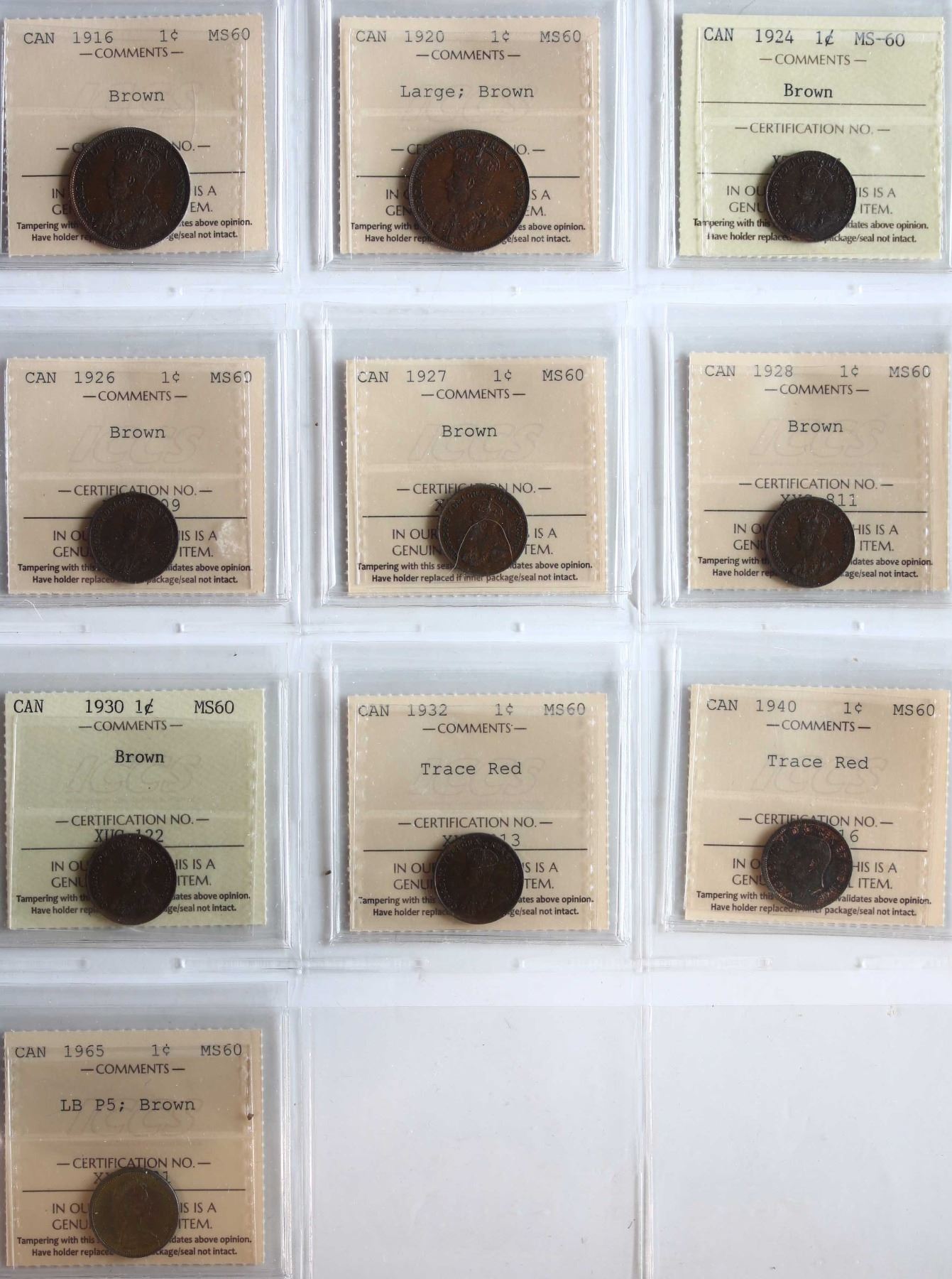1916 1¢, 1920 "Large", 1924, 1926, 1927, 1928, 1930, 1932, 1940, 1965 "Type IV" All 10 coins ICCS Mint State-60.