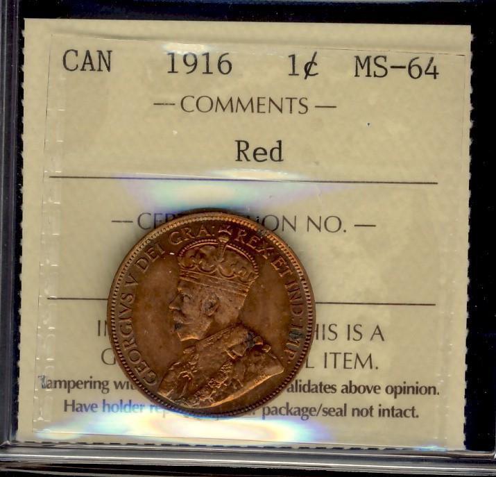 1916 1¢ ICCS MS64RD. Lots of lustre with some spotting.