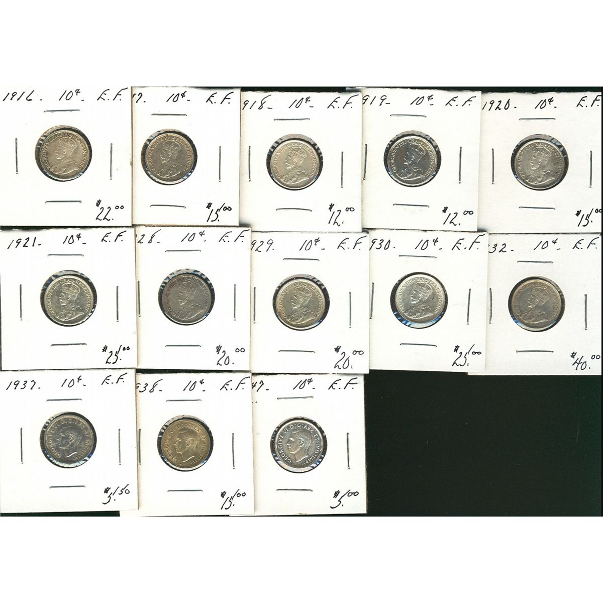 1916 10¢, 1917-1930, 1932, 1937, 1938 & 1947ML. Lot of 13 coins all EF. (PBA).