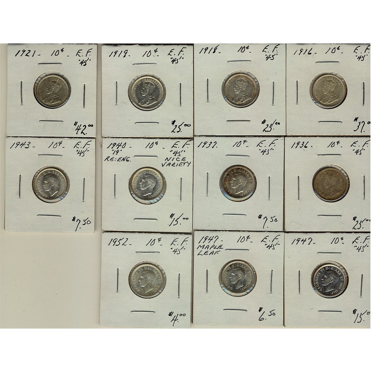 1916 10¢, 1918, 1919, 1921, 1936, 1937, 1940 Re eng, 1943, 1947, 1947ML & 1952. Lot of 11 coins EF45. (PBA)