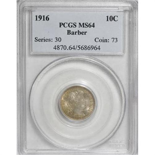 <B>1916 10C MS64 PCGS.</B></I> PCGS Population (269/142). NGC Census: (275/152). Mintage: 18,490,000. Numismedia Wsl. Price for NGC/PCGS coin in MS64: $252. (#4870)<BR><BR><B>Coin Engraver:</B> Charles E. Barber<BR><BR><b>Shipping:</b> Coins & Currency (<a target="_blank" href="http://www.heritageauctions.com/common/shipping.php">view shipping information</a>)